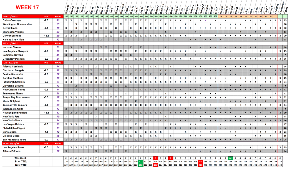 Week 17 16-1 10- Mark B @430 3- Daryn P, Dan P 138- Joe M 56.33%